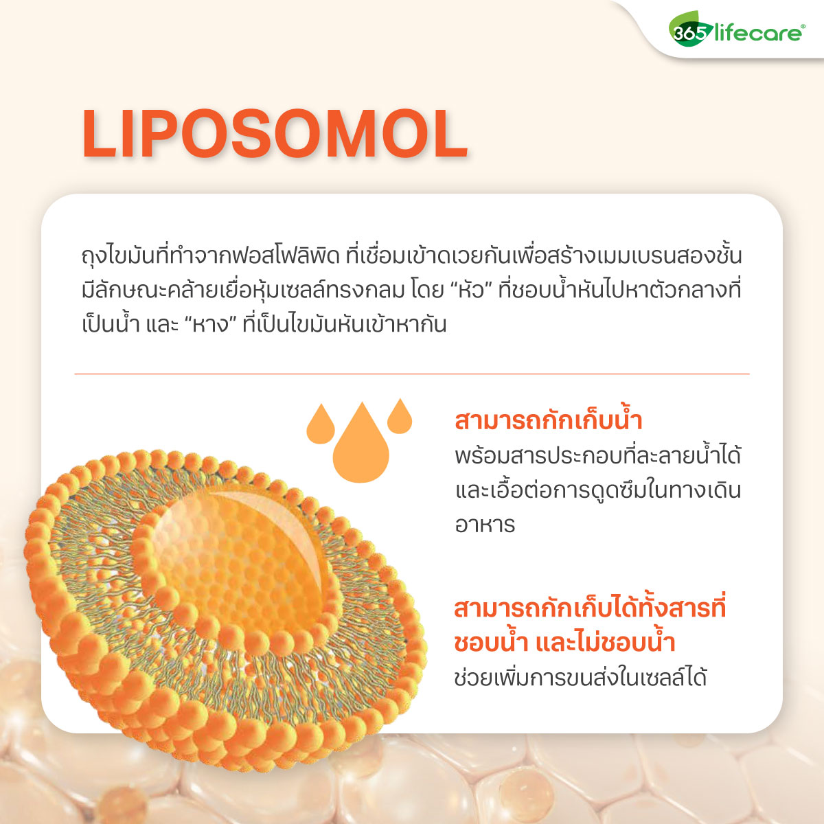Liposomal Technology เป็นการใช้สารไขมัน Phospholipid (ชนิดเดียวกับผนังเซลล์ของมนุษย์) มาสร้างเป็นเกราะทรงกลมขนาดเล็กหุ้มโมเลกุลของวิตามินซีไว้ เปรียบเสมือน “ยานพาหนะพิเศษ” ที่จะช่วย