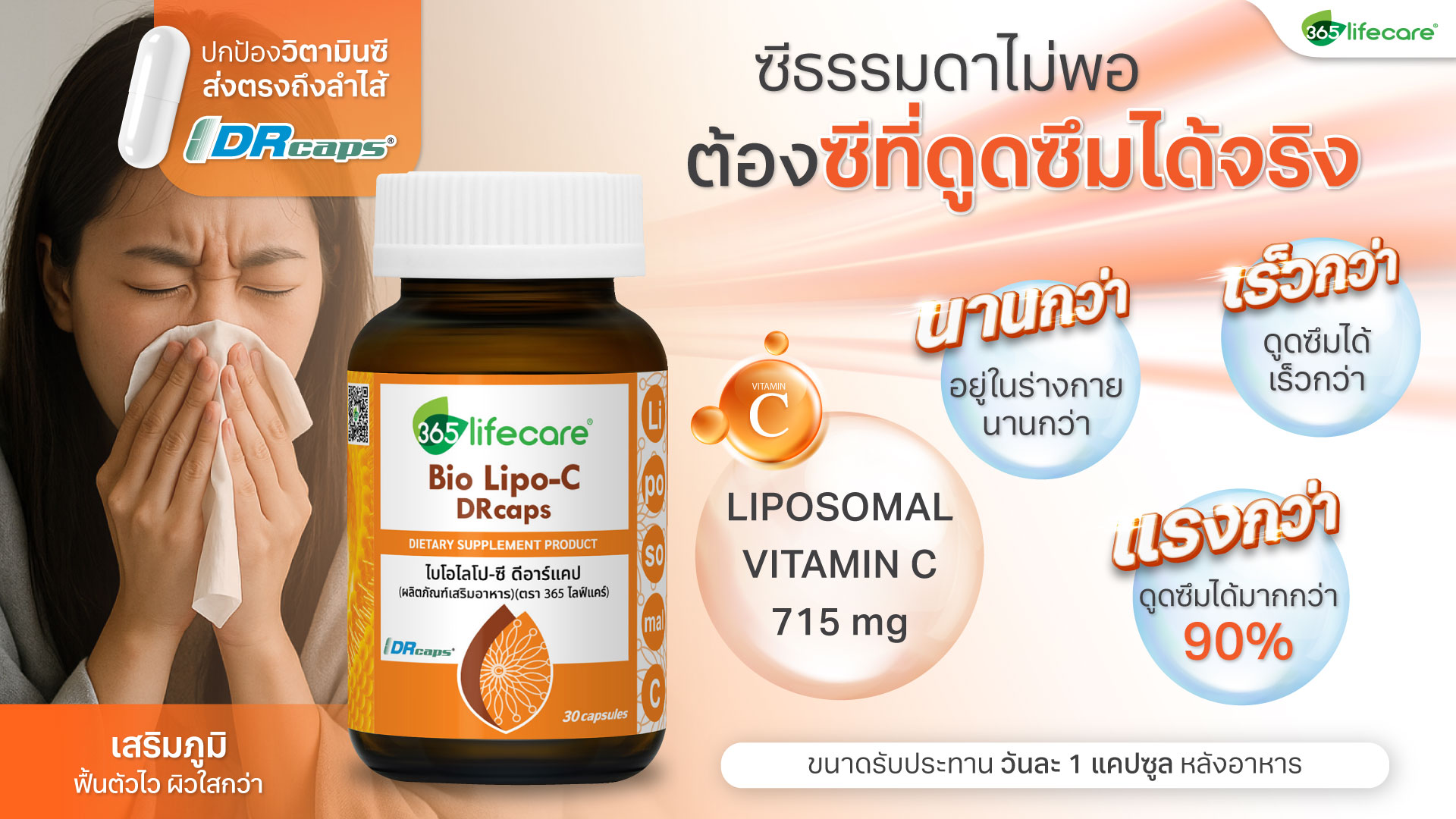 จุดเปลี่ยนของเรื่องนี้ คือ วิตามินซีไลโปโซม ที่พัฒนาโดยใช้เทคโนโลยี Liposomal Technology ซึ่งใช้ไขมันฟอสโฟลิพิดชนิดเดียวกับเยื่อหุ้มเซลล์ของมนุษย์มาห่อหุ้มวิตามินซี ช่วยพาวิตามินซีเข้าสู่ร่างกายไดอย่างมีประสิทธิภาพสูงสุด