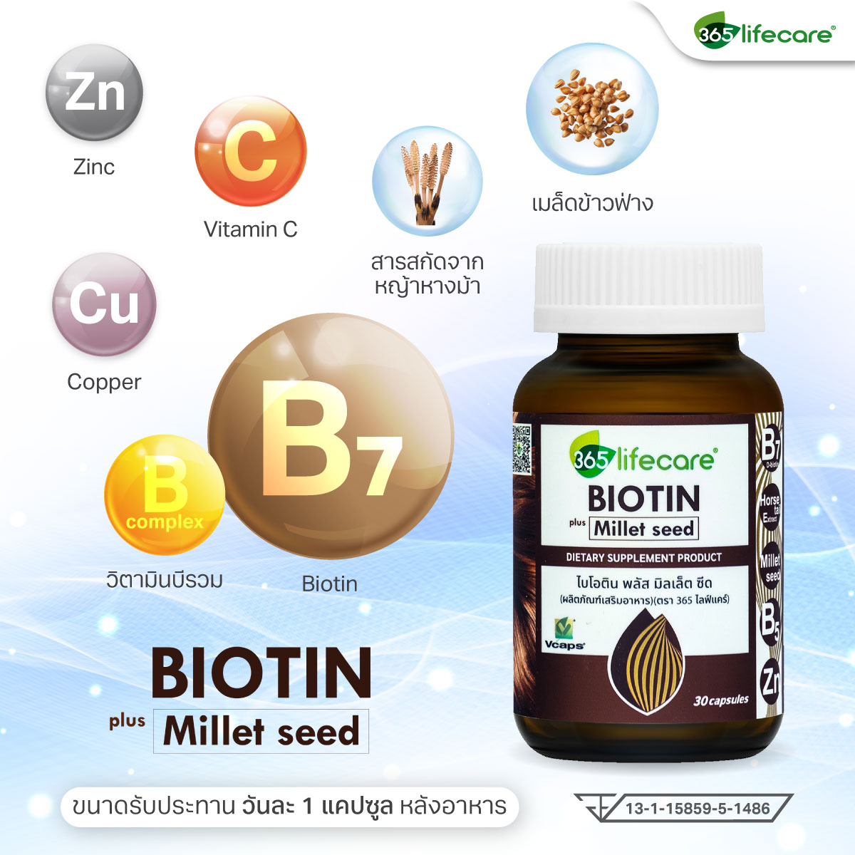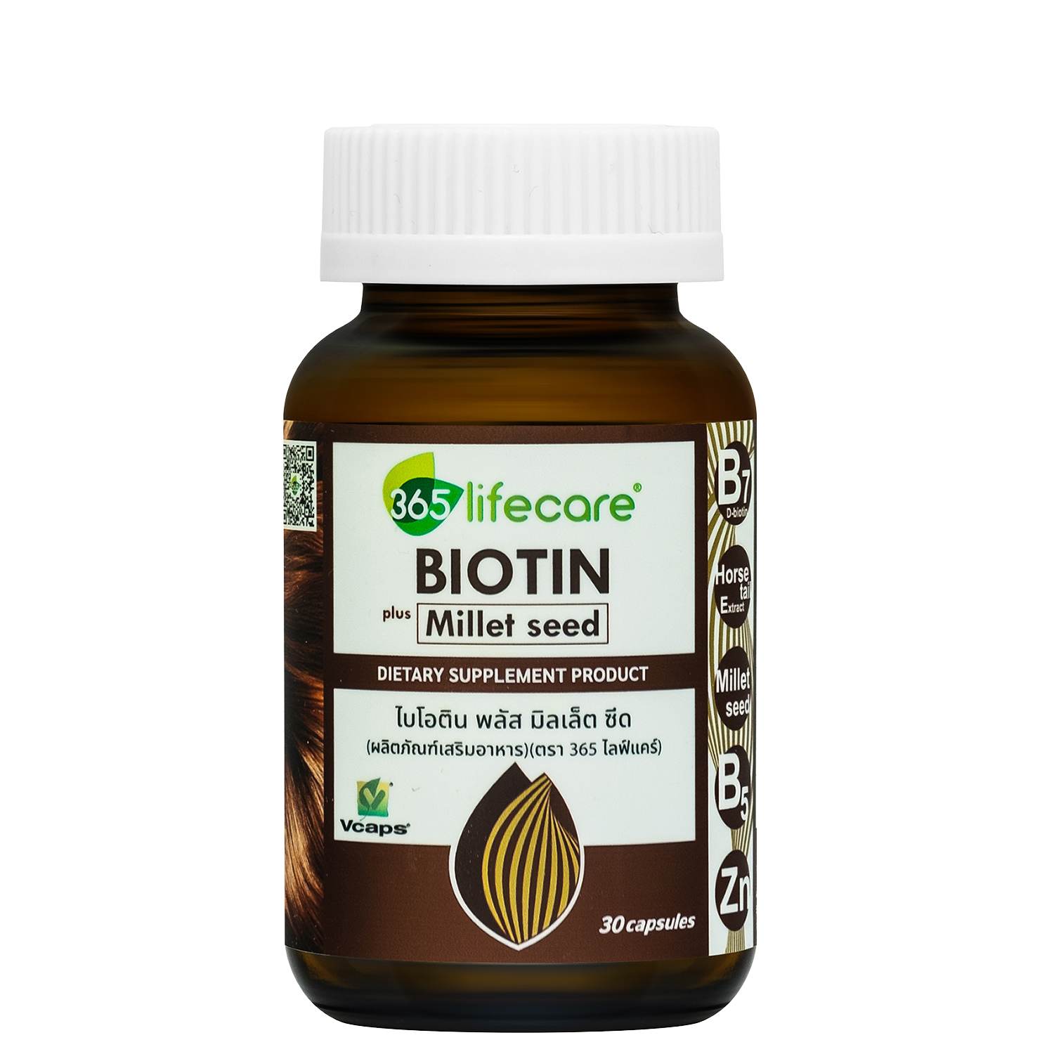 - ไบโอติน (Biotin): หรือที่รู้จักกันในชื่อวิตามินบี 7 หรือวิตามินเอช มีหน้าที่กระตุ้นการผลิต เคราติน ซึ่งเป็นโปรตีนหลักที่เป็นโครงสร้างของเส้นผม, เล็บ และผิวหนัง หากขาดไบโอตินอาจทำให้ผมร่วง ผมบาง และเล็บเปราะ